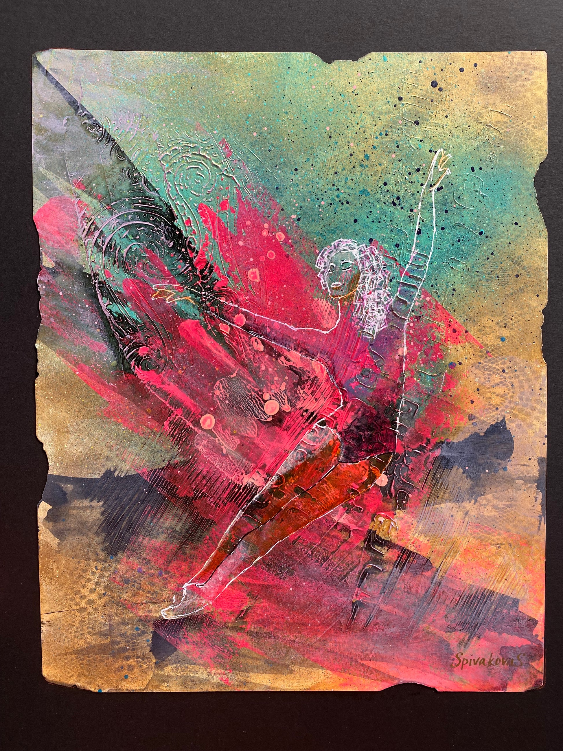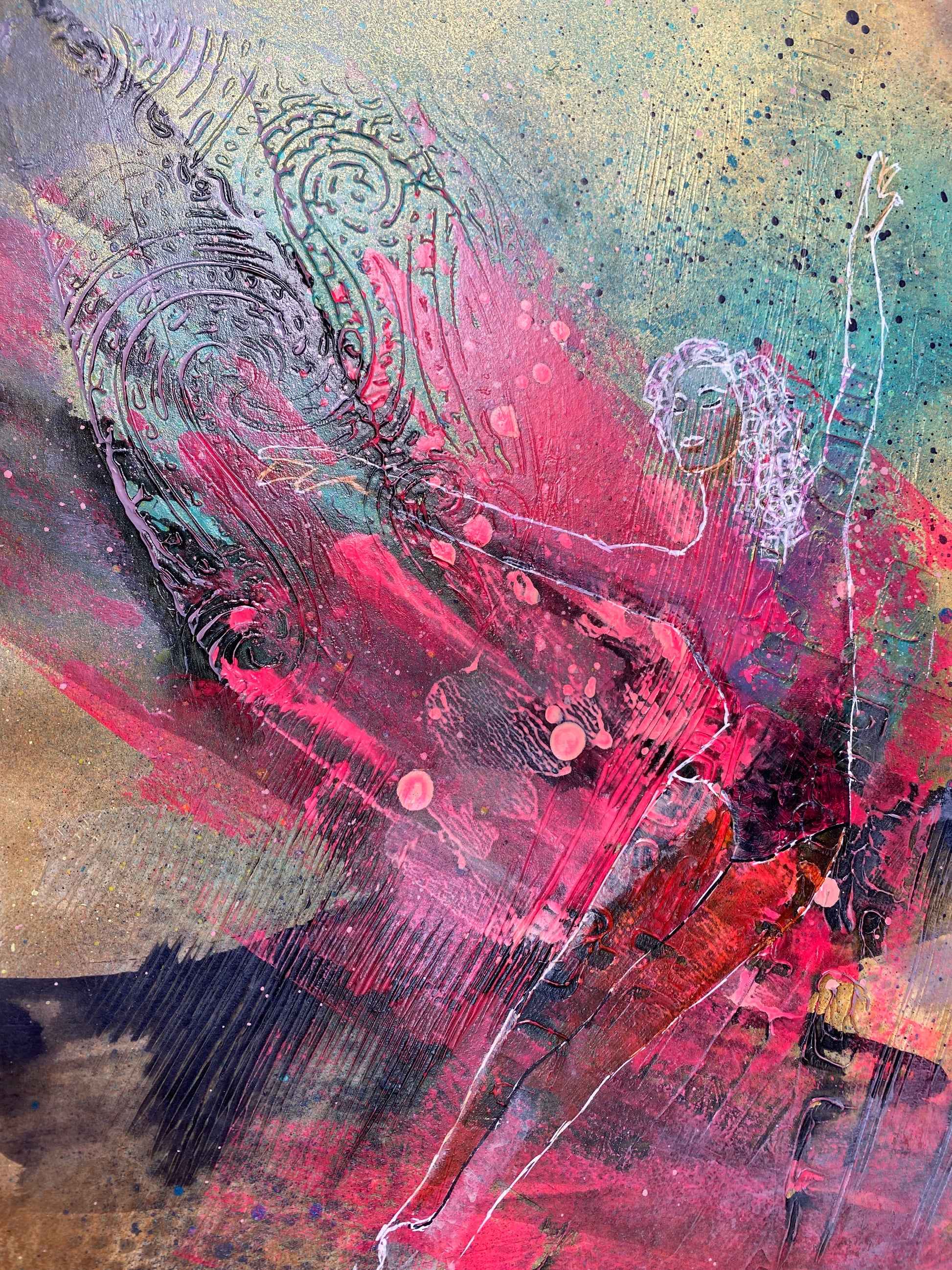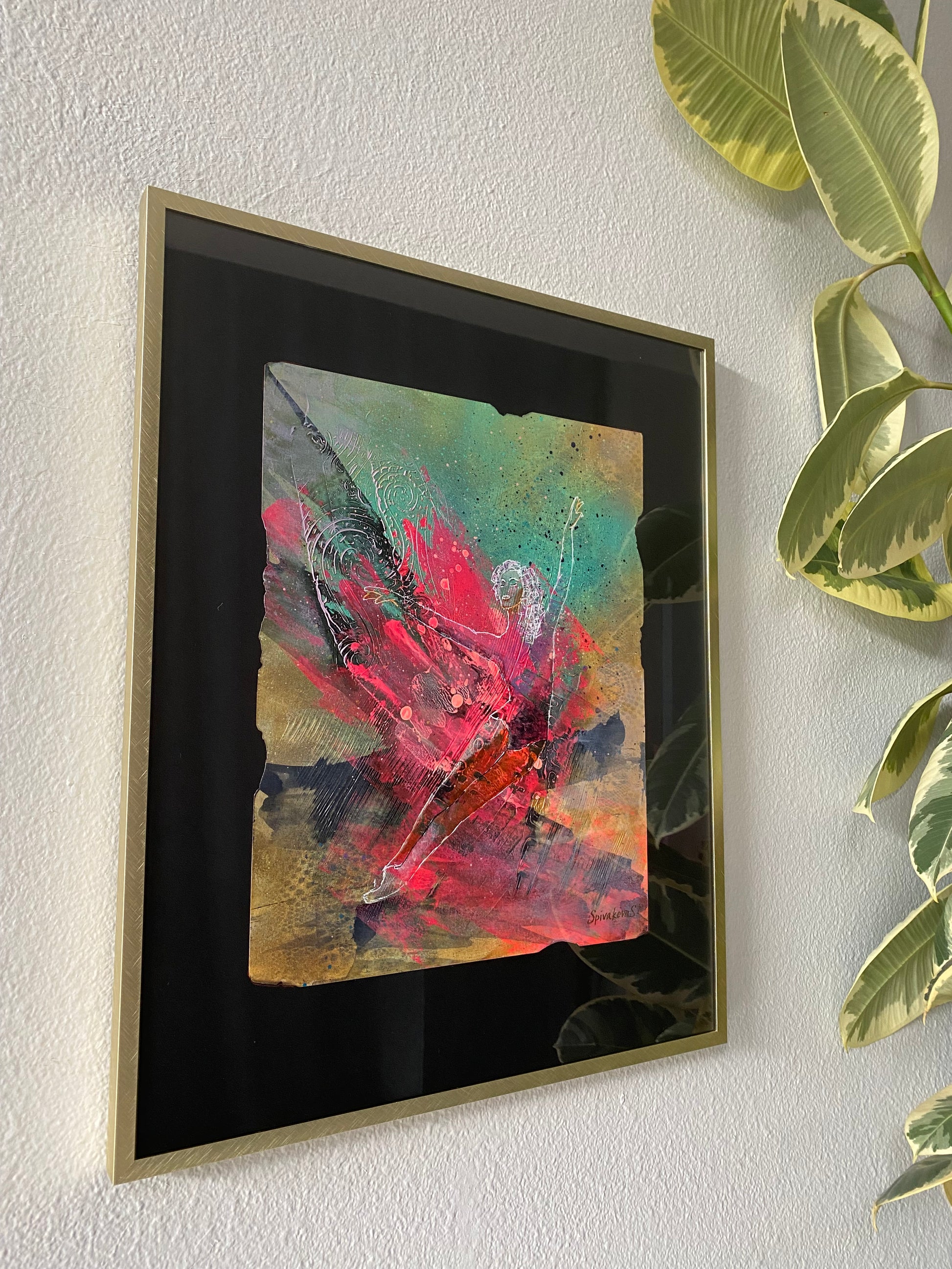 Mixed media: different type of acrylics, spray paint, markers, inks, acrylic medium. The edges of the painting crafted with flame. The painting is mounted to a black mounting board, and framed.