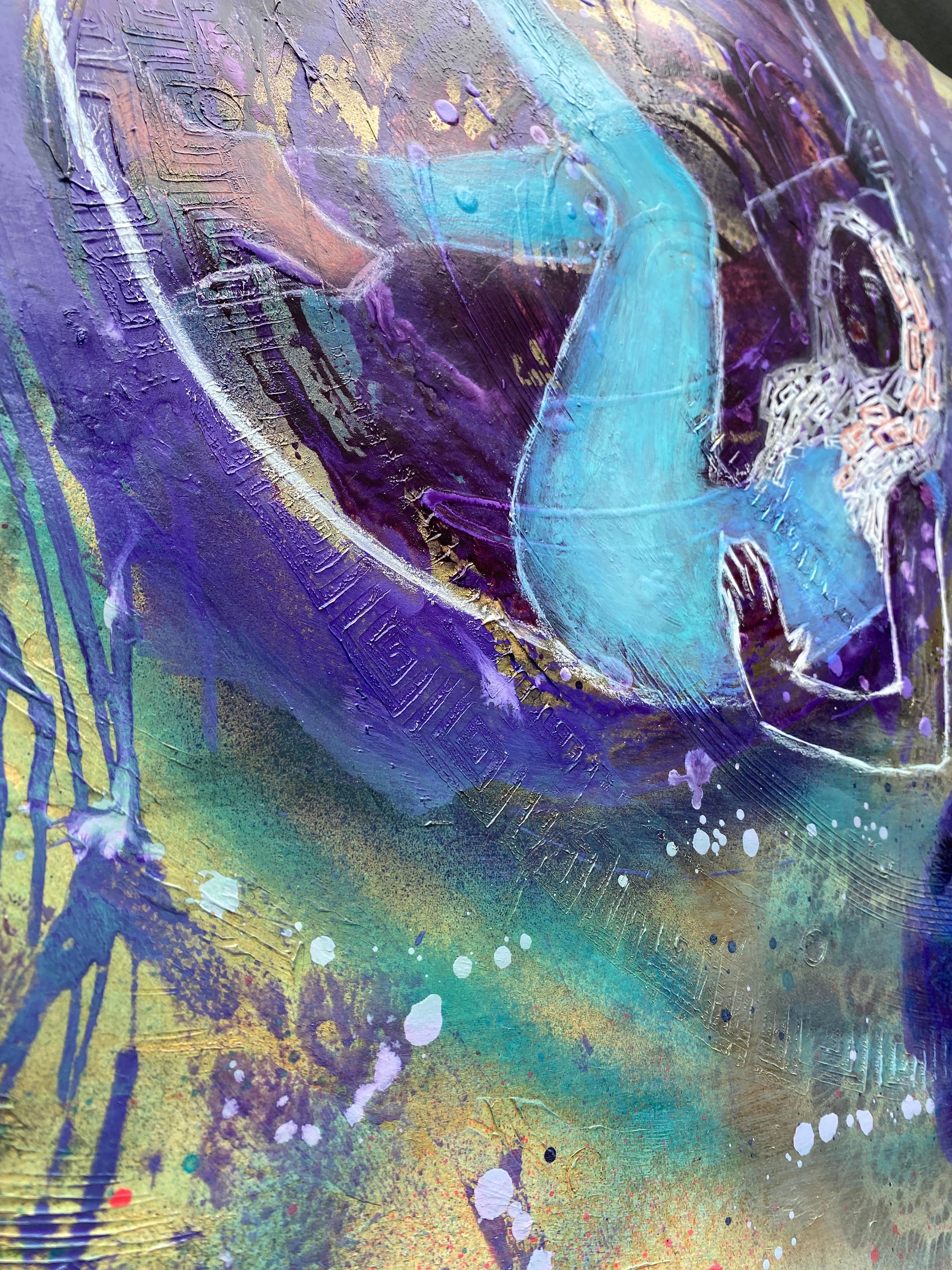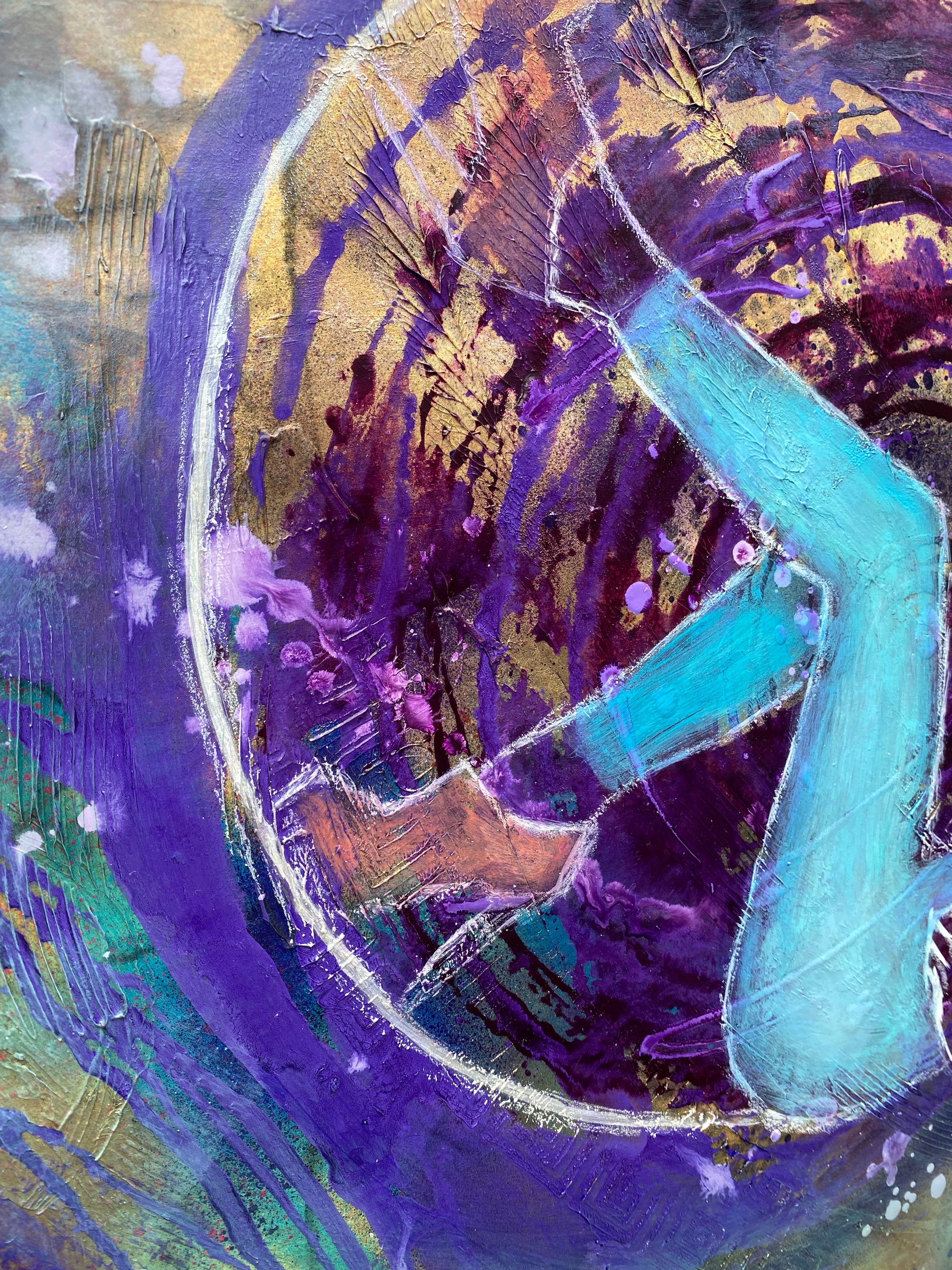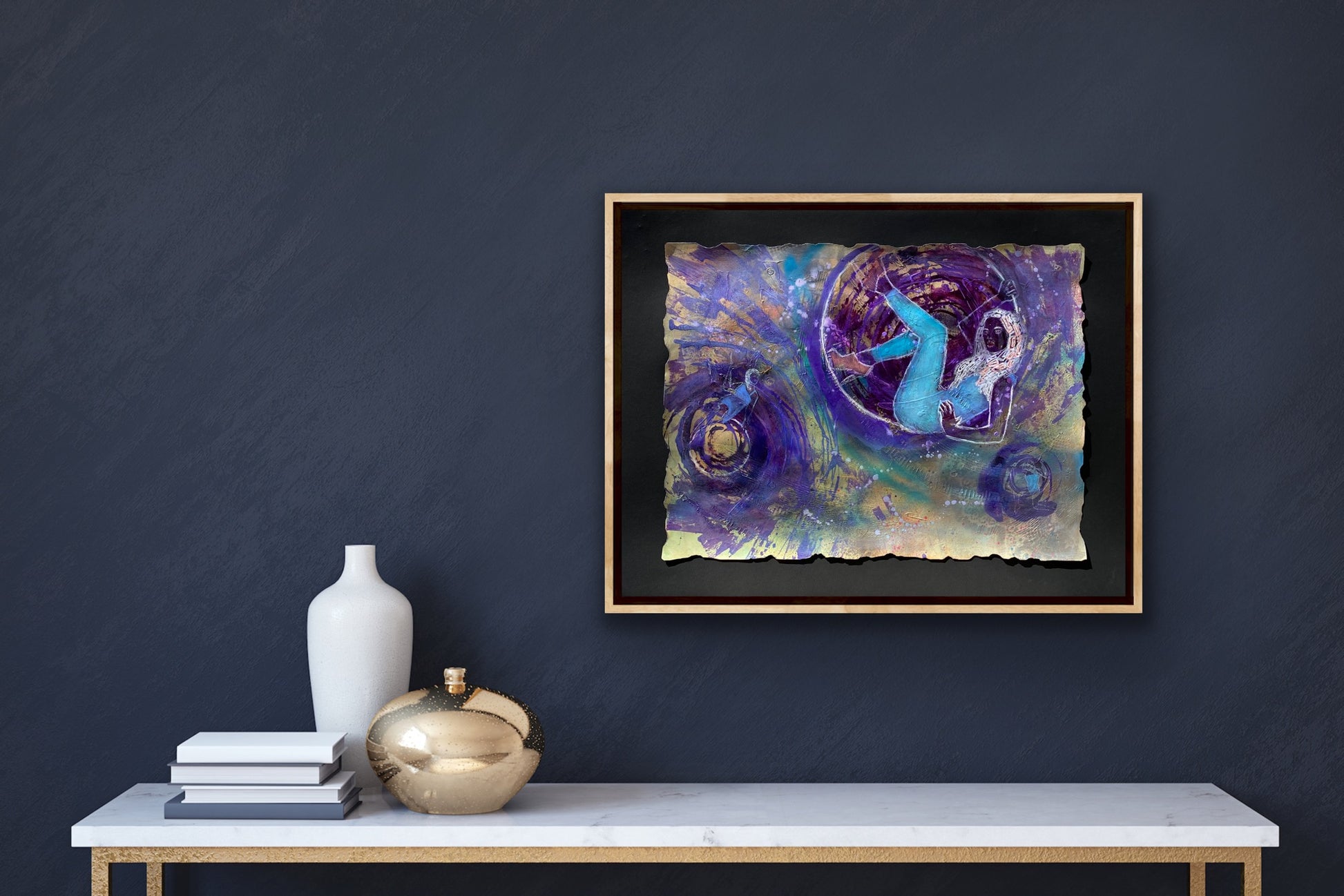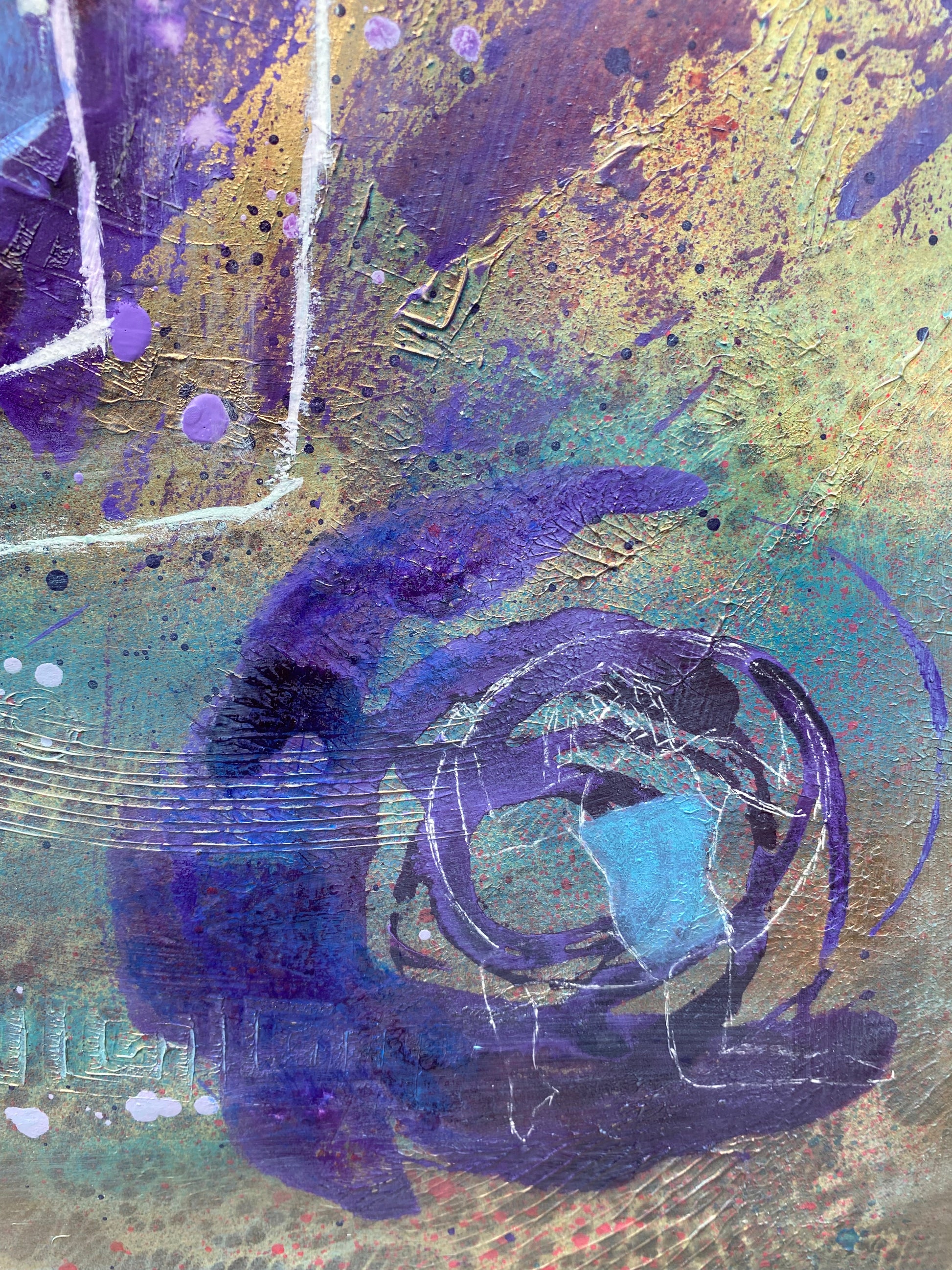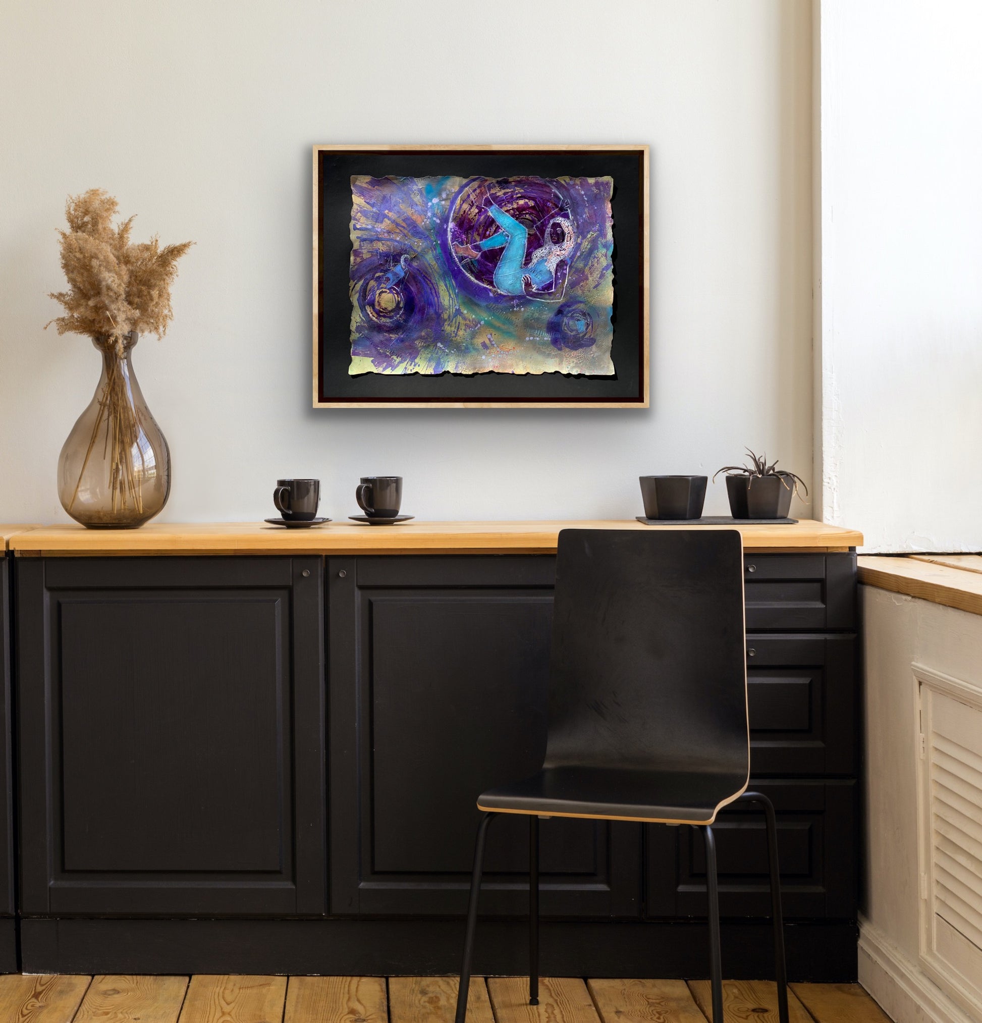 Mixed media: different type of acrylics, modeling paste, oil paint on paper. The edges of the painting crafted with flame. Black background is only to show unique edges and not included in the price.