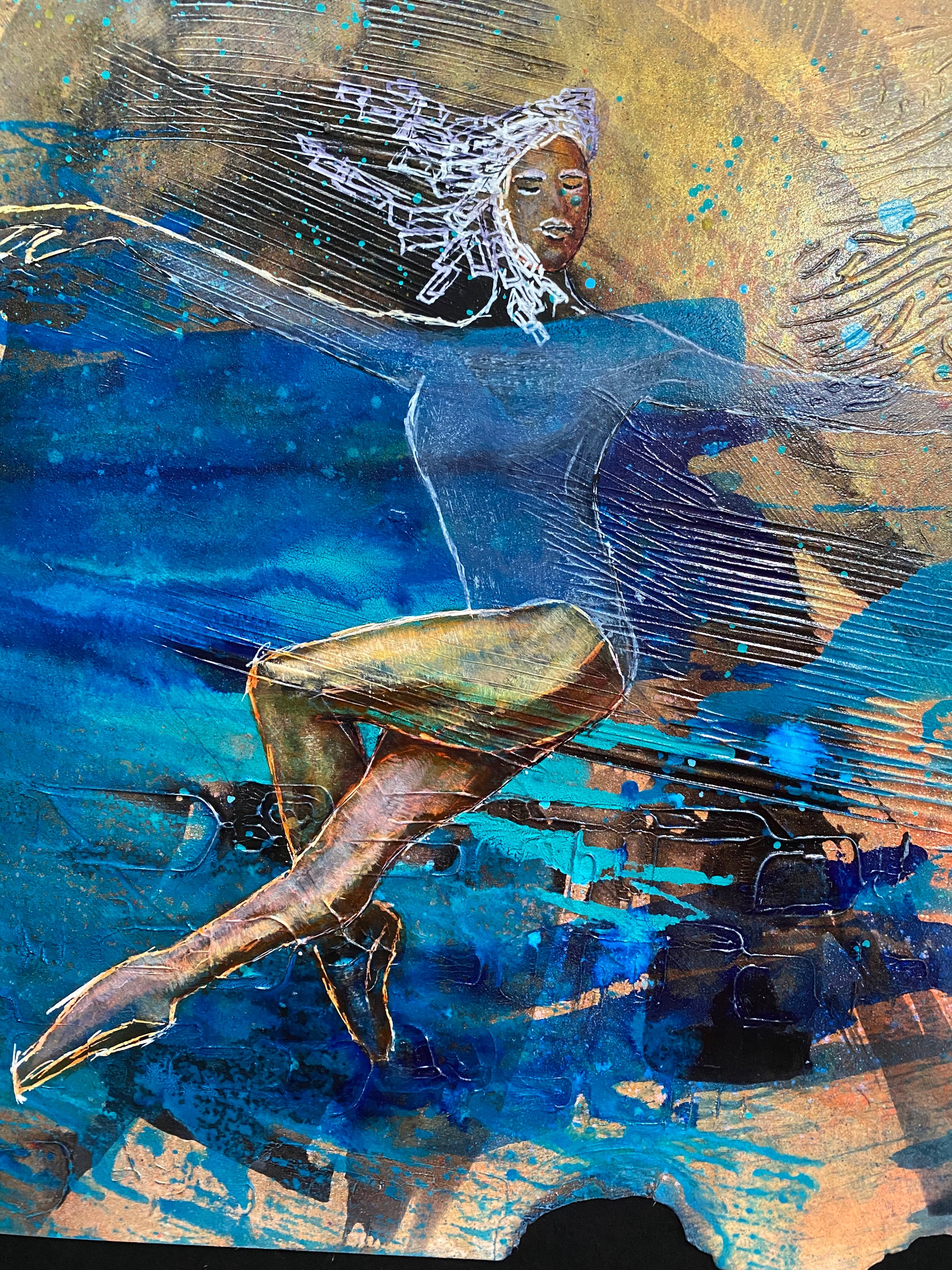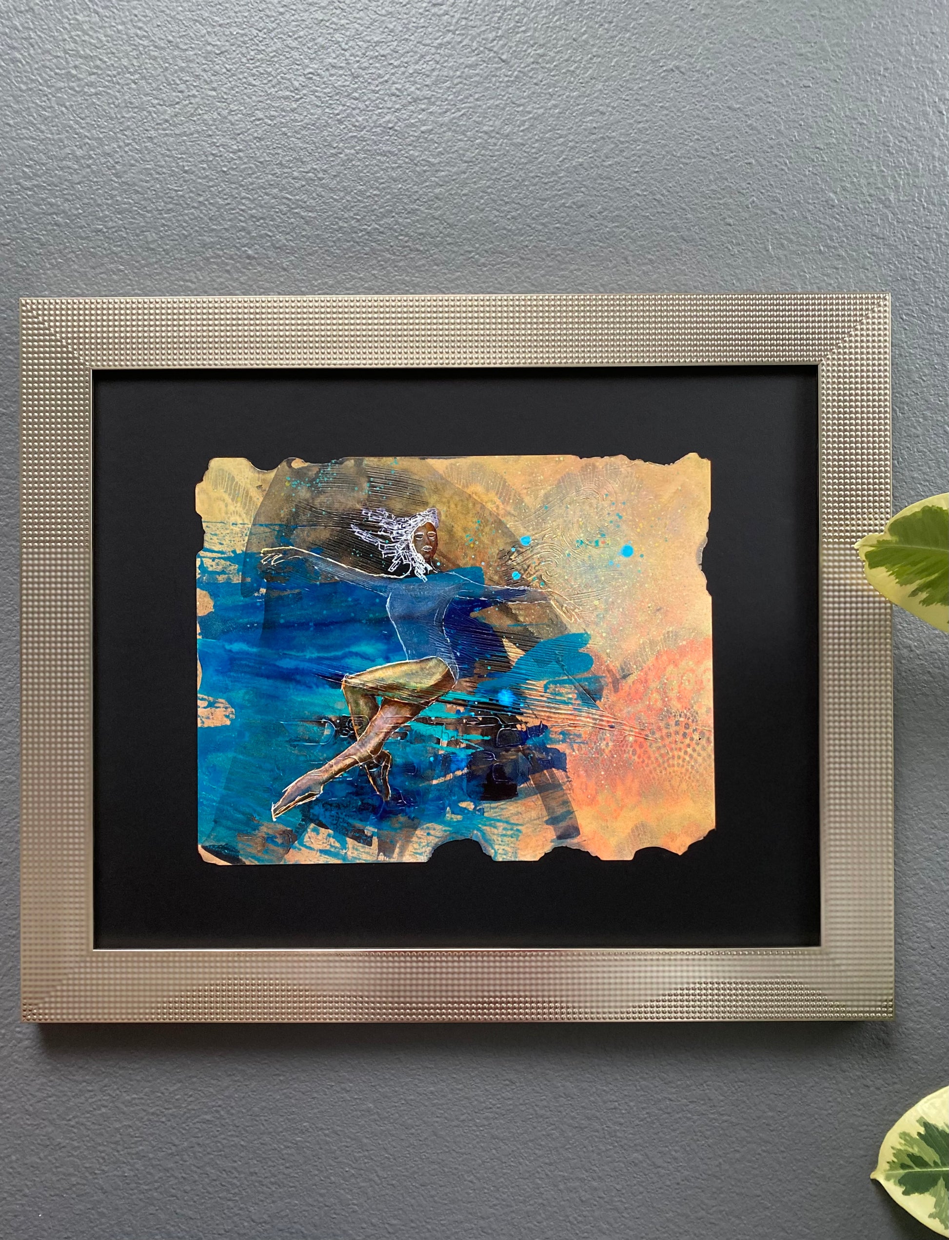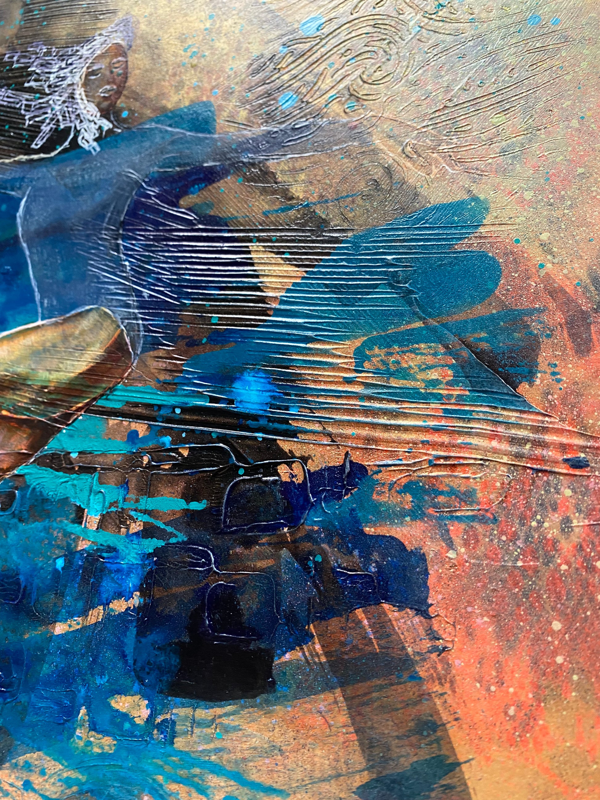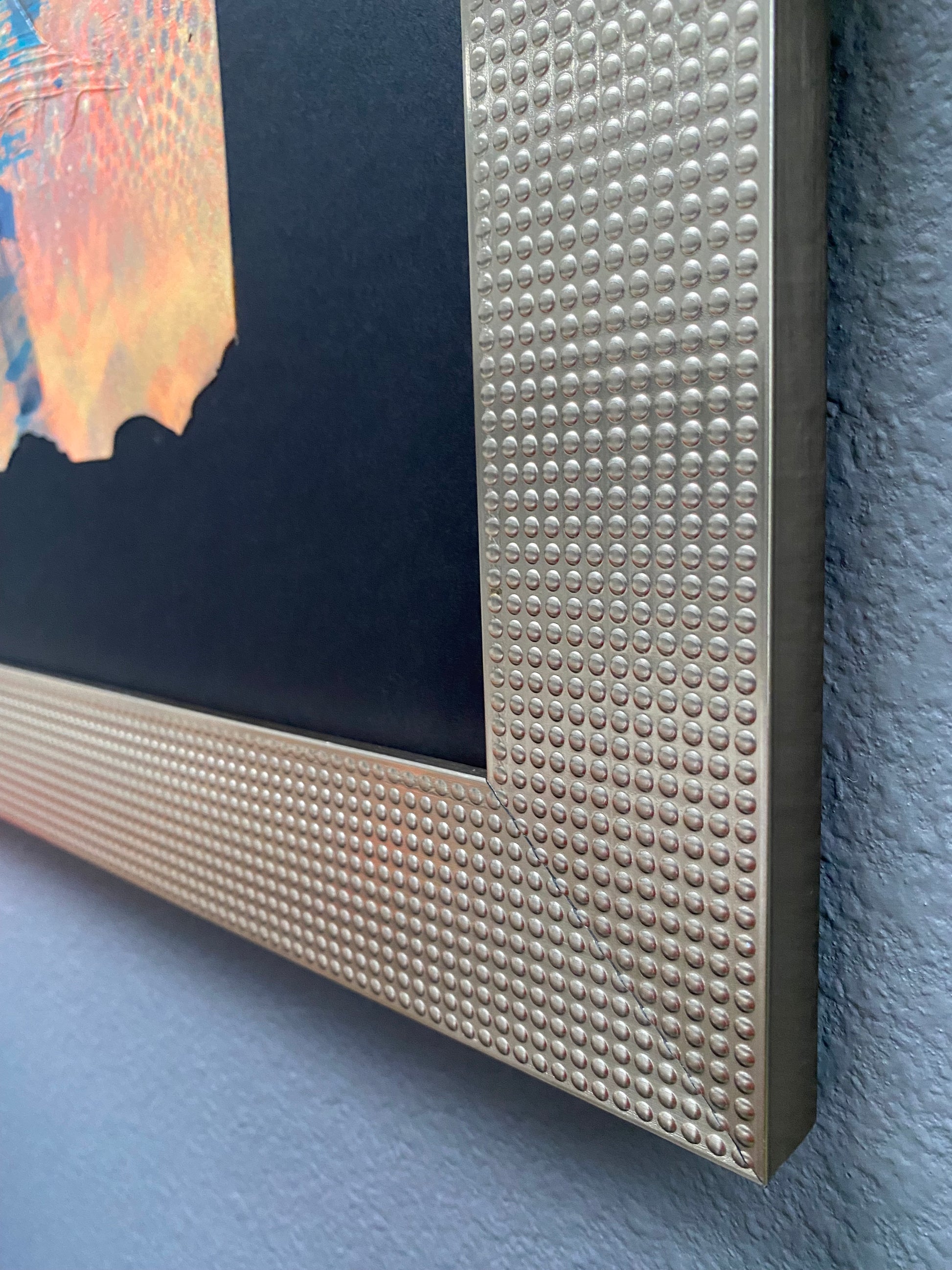 Mixed media: different type of acrylics, spray paint, markers, inks, acrylic medium. The edges of the painting crafted with flame. The painting is mounted to a black mounting board, and framed.