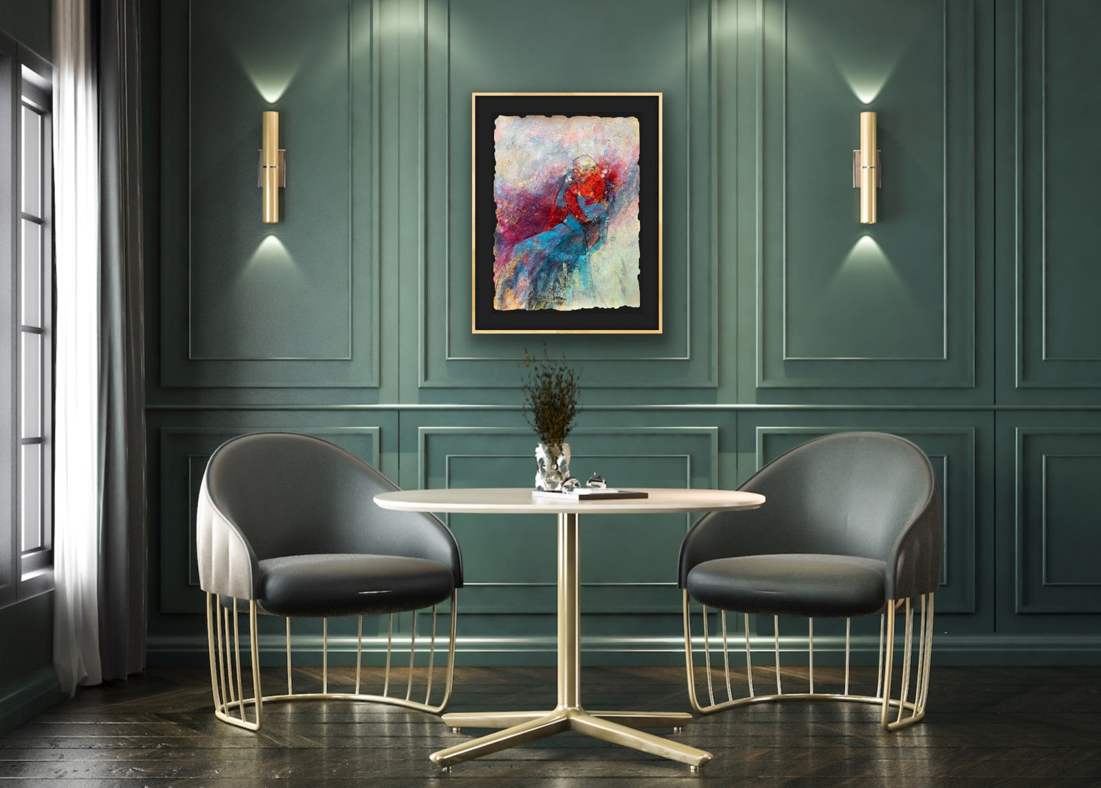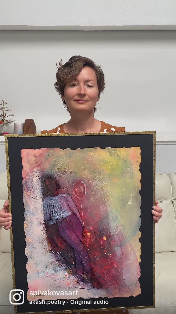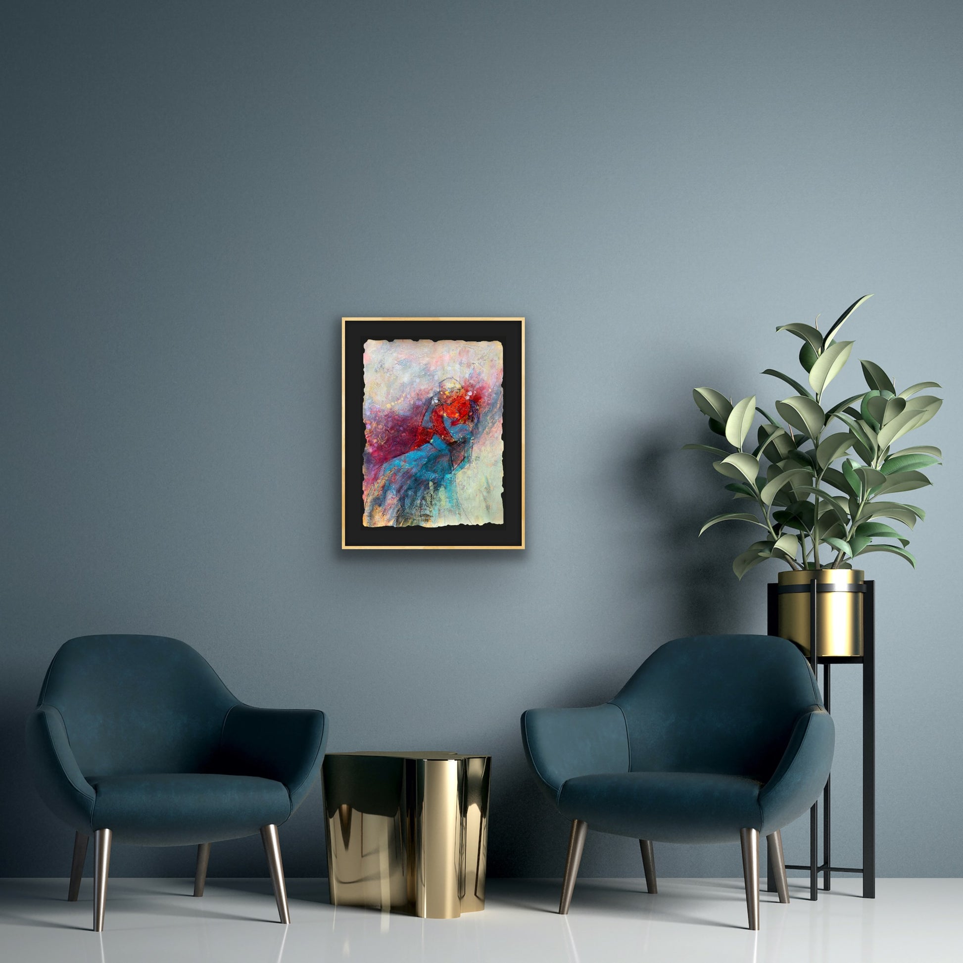 Mixed media: different types of acrylics, modeling paste, and oil paint on paper. The edges of the painting crafted with flames. The painting is glued to ultra-black mounting board and framed in hand painted metal frame.