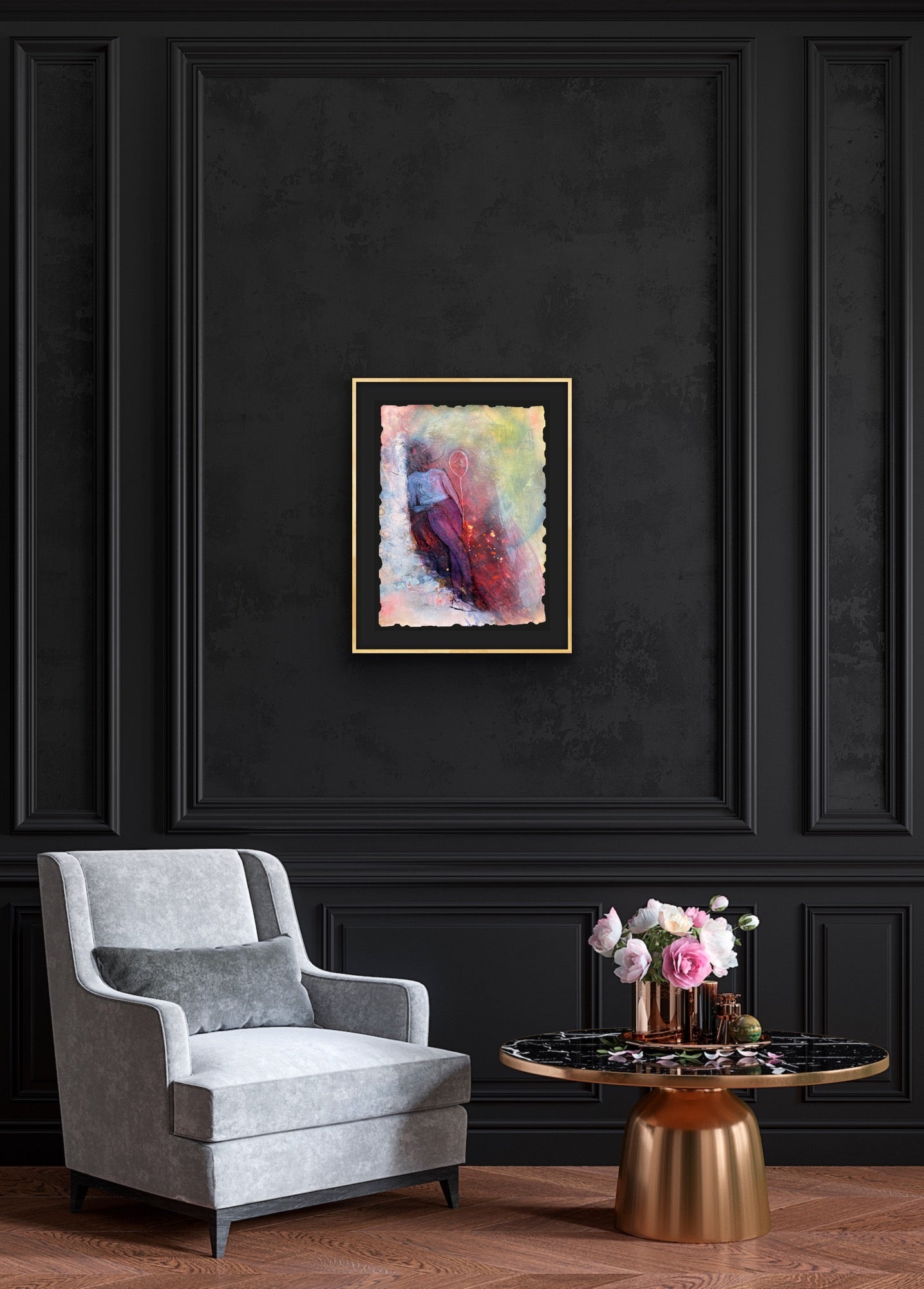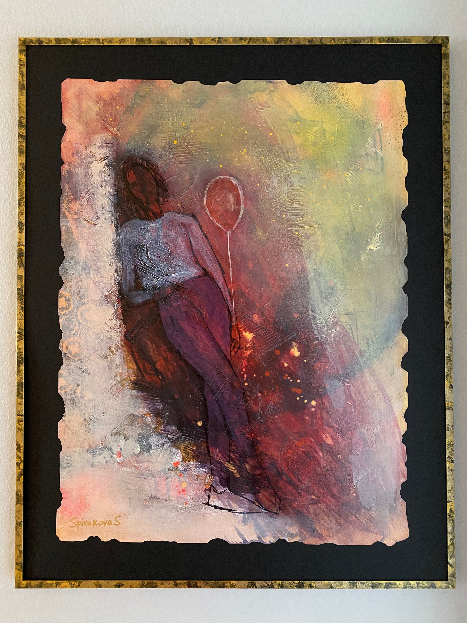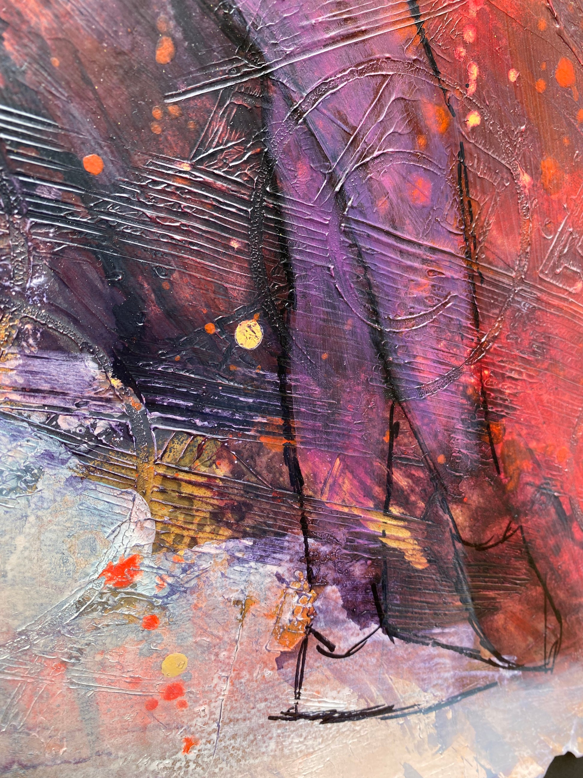 Mixed media: different types of acrylics, modeling paste, and oil paint on paper. The edges of the painting crafted with flames. The painting is glued to ultra-black mounting board and framed in hand painted metal frame.