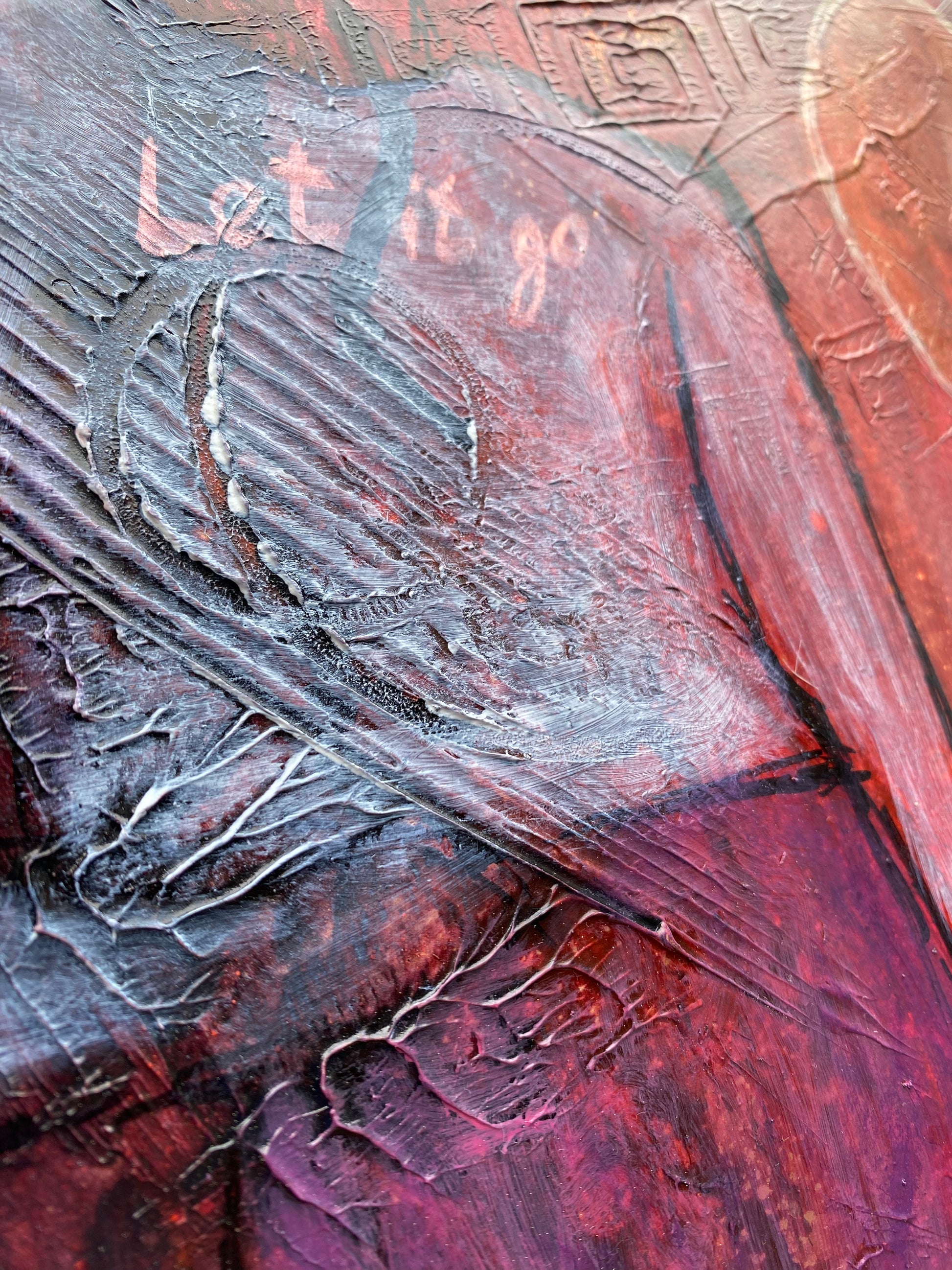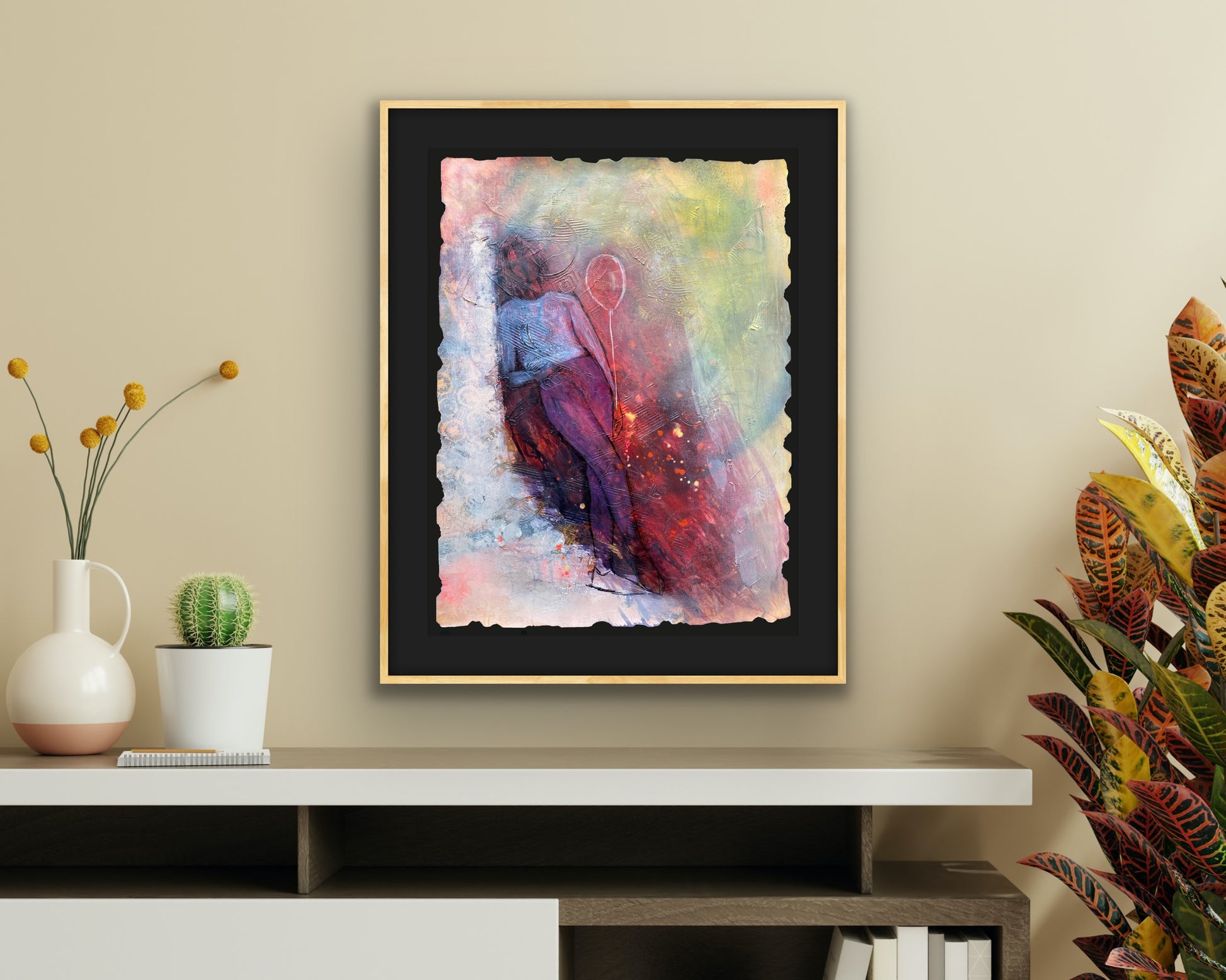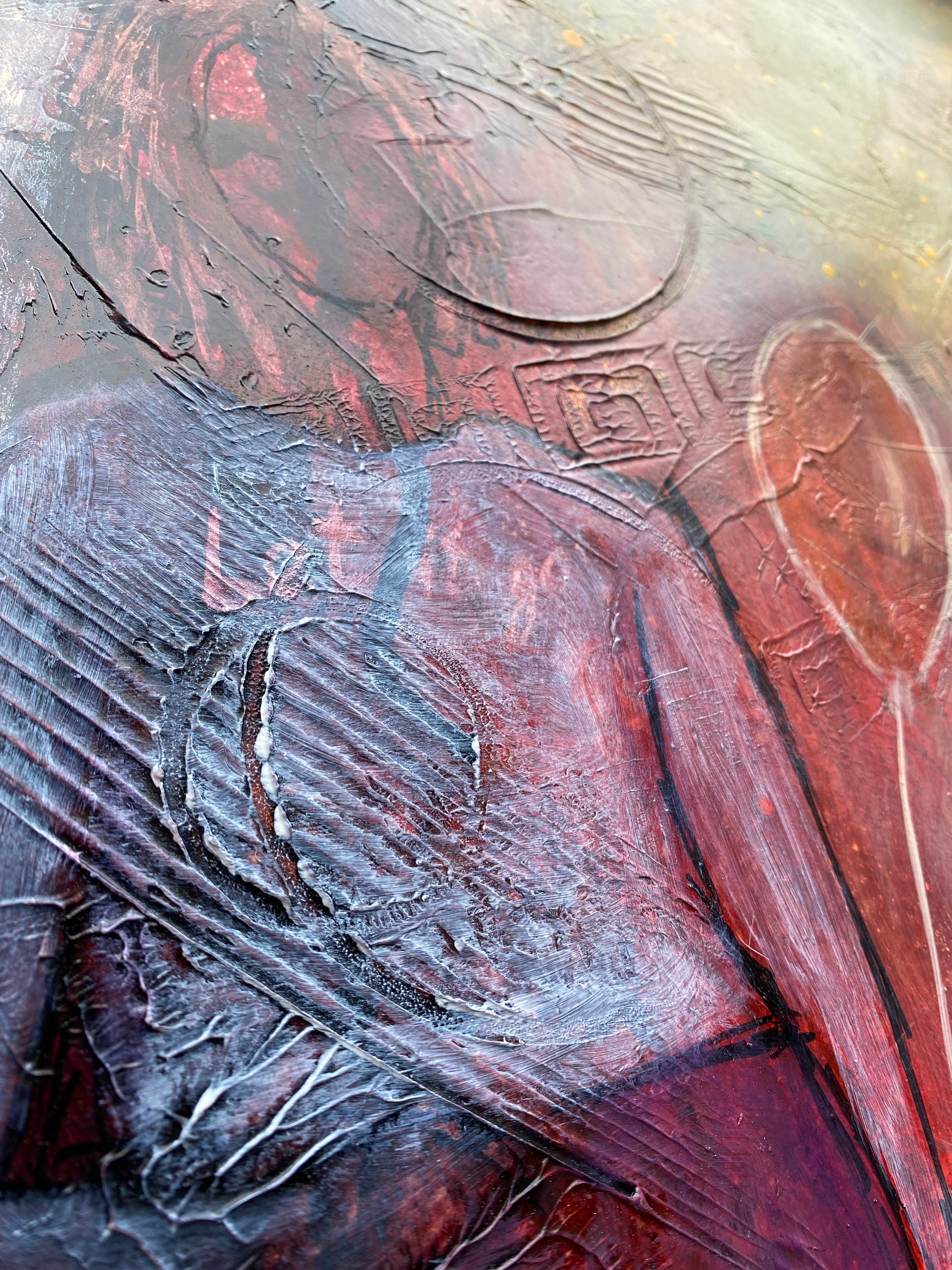 Mixed media: different types of acrylics, modeling paste, and oil paint on paper. The edges of the painting crafted with flames. The painting is glued to ultra-black mounting board and framed in hand painted metal frame.
