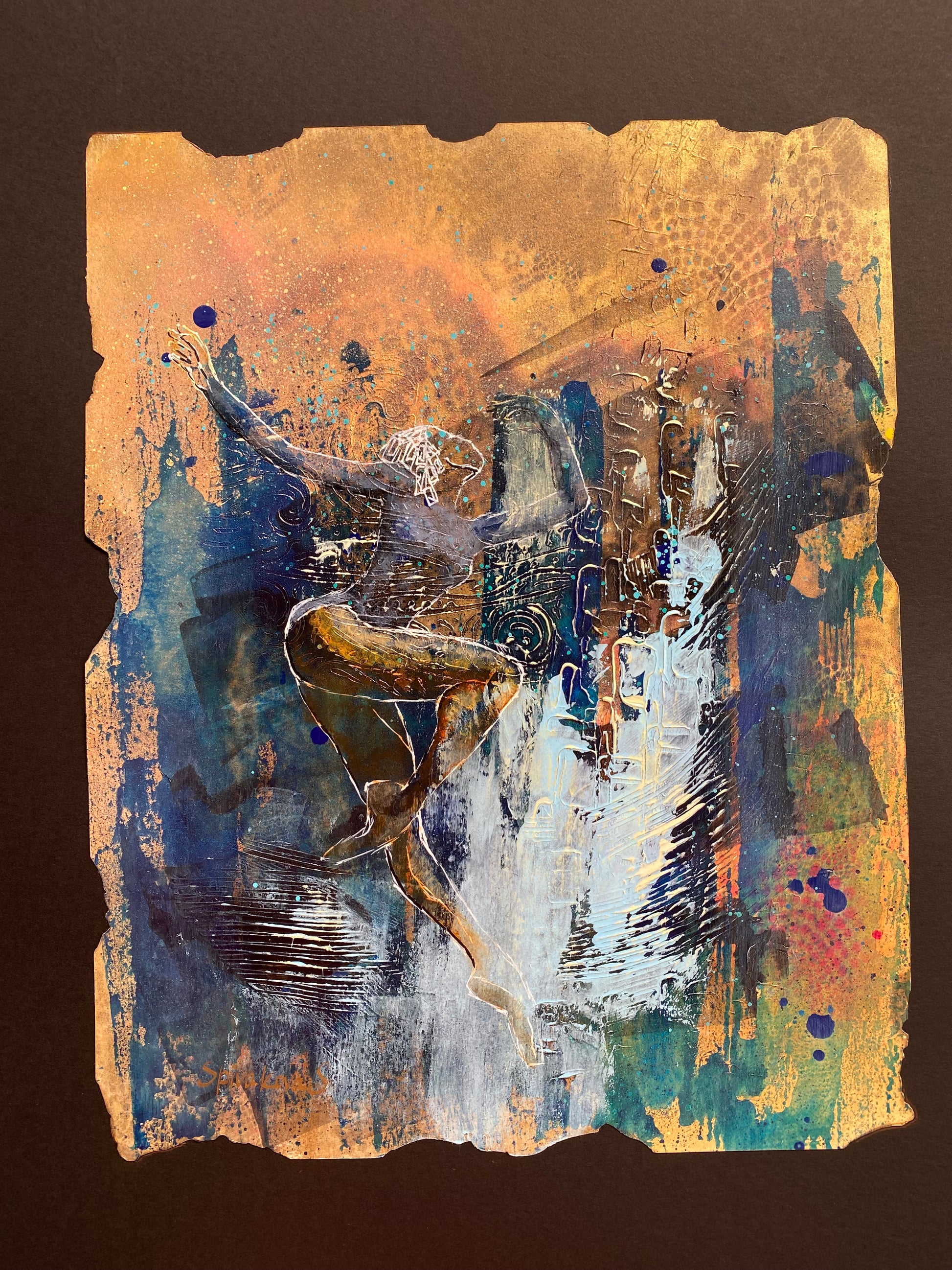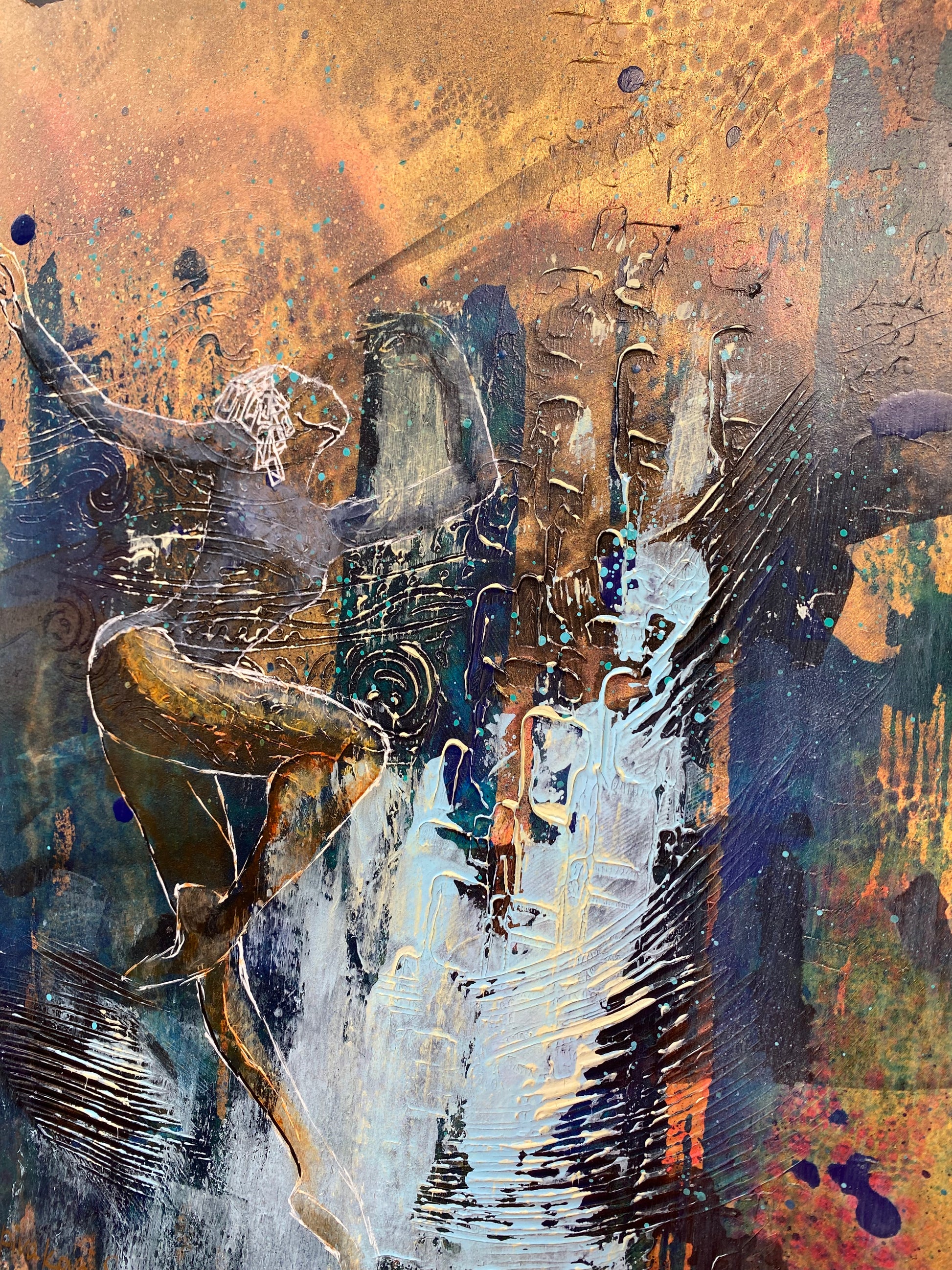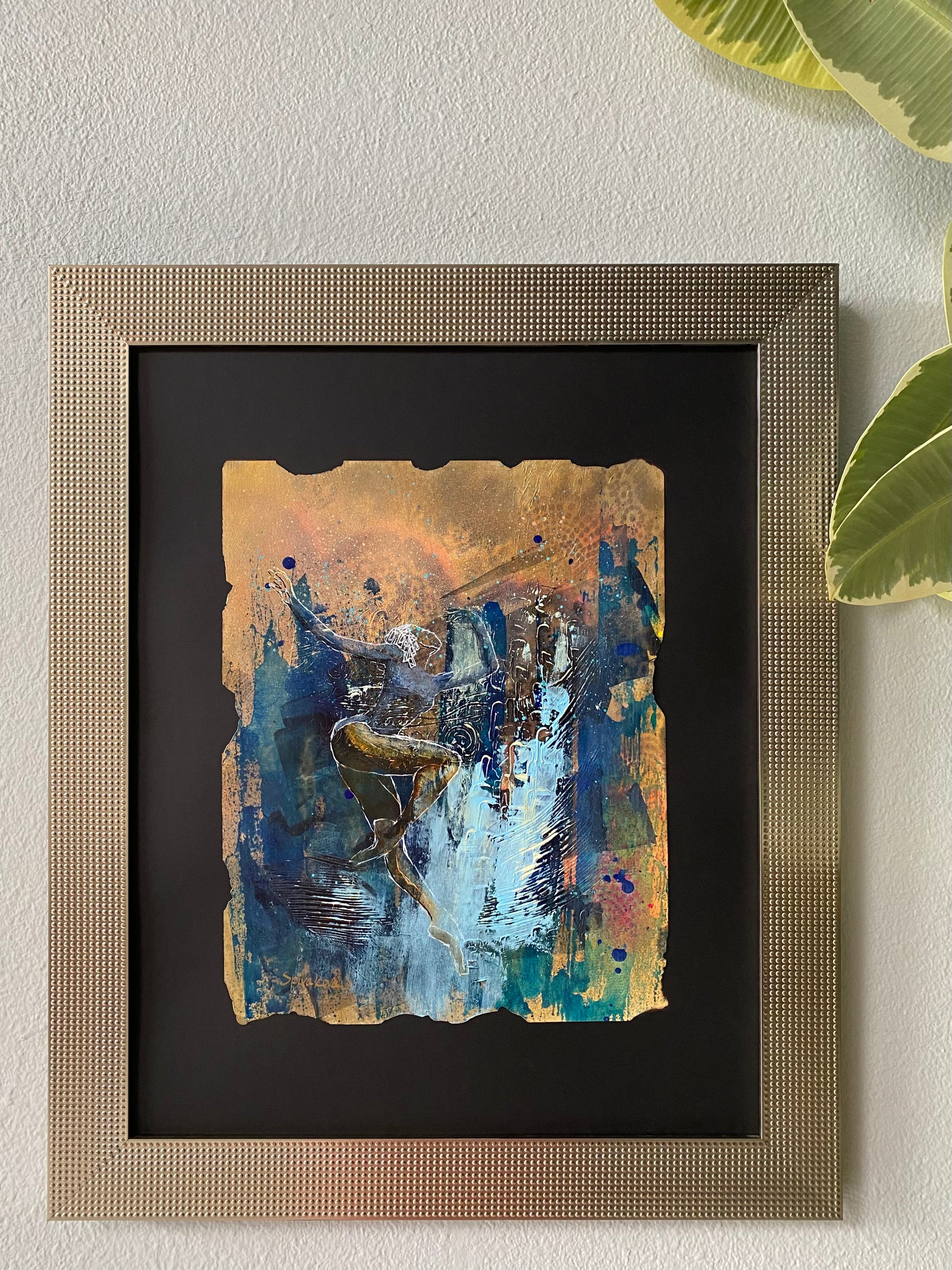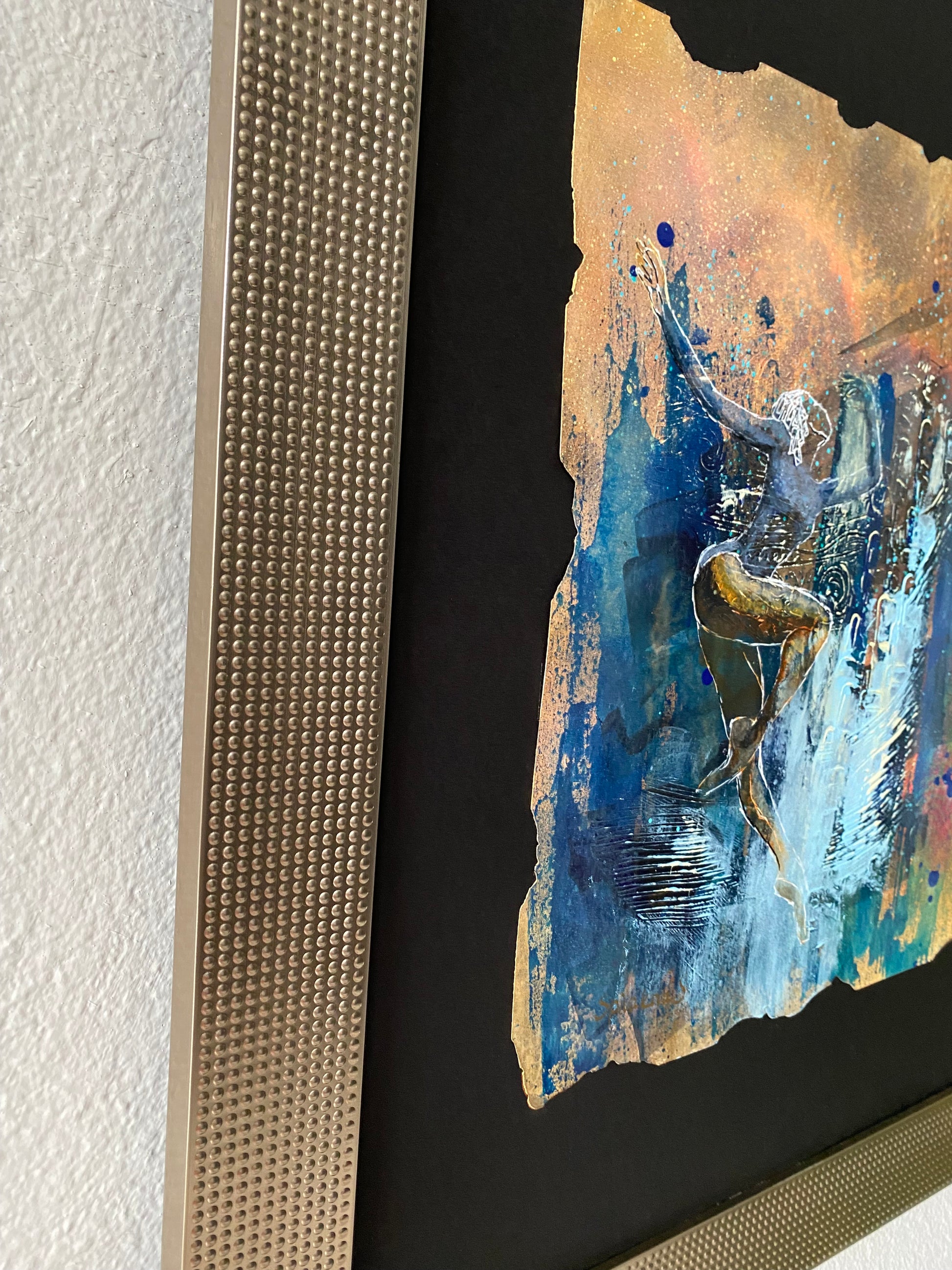 Mixed media: different type of acrylics, spray paint, markers, inks, acrylic medium. The edges of the painting crafted with flame. The painting is mounted to a black mounting board, and framed.