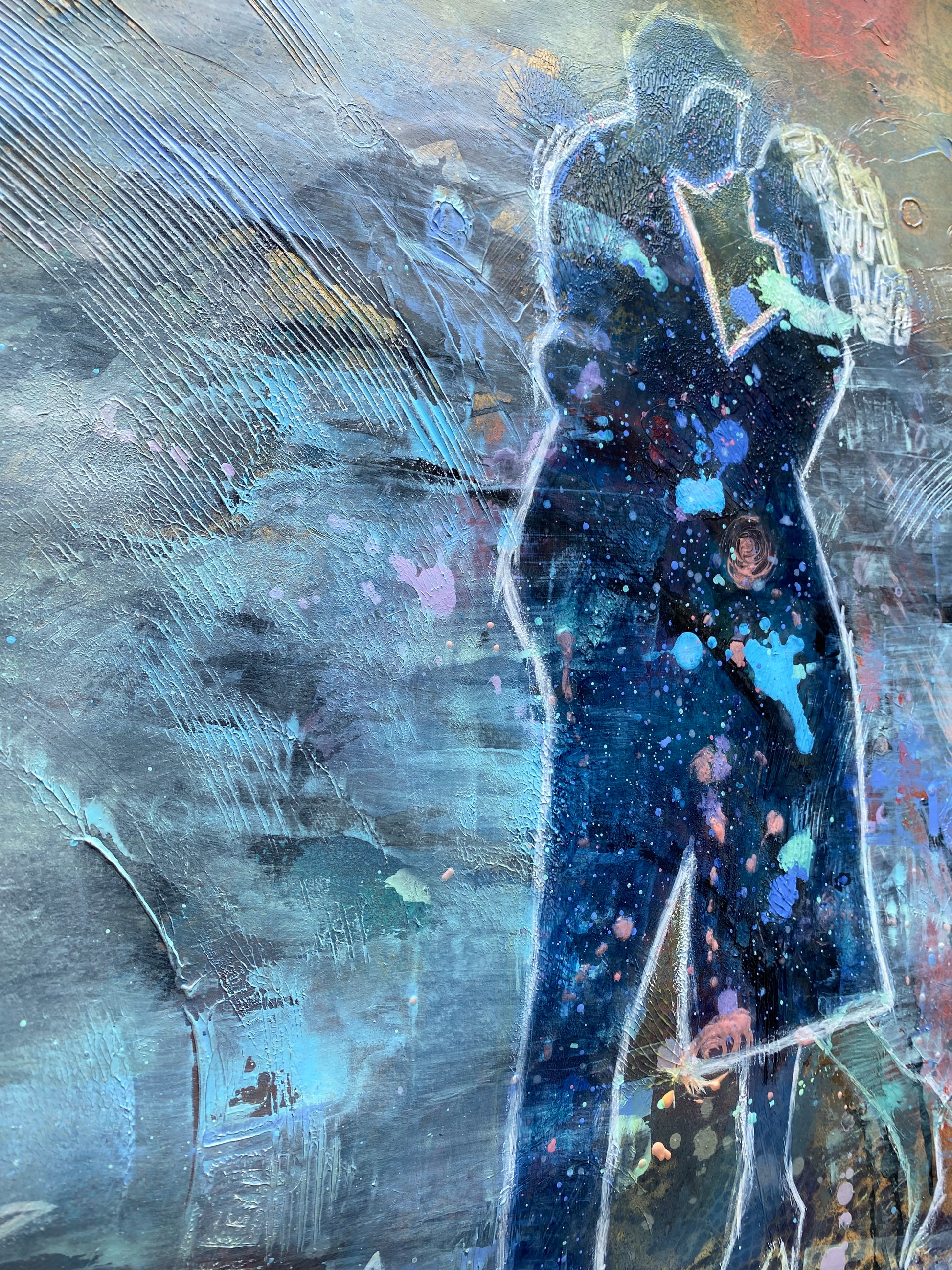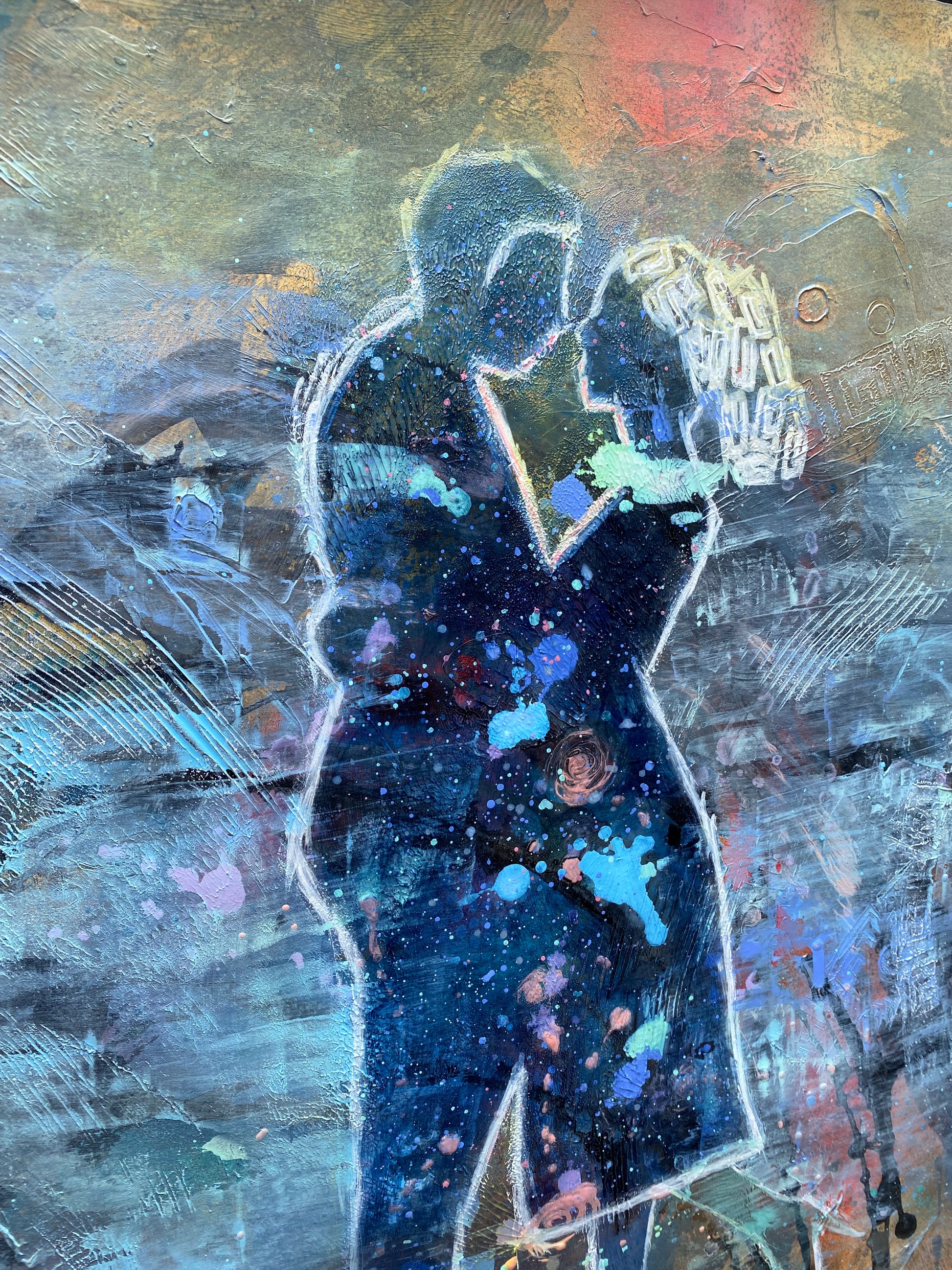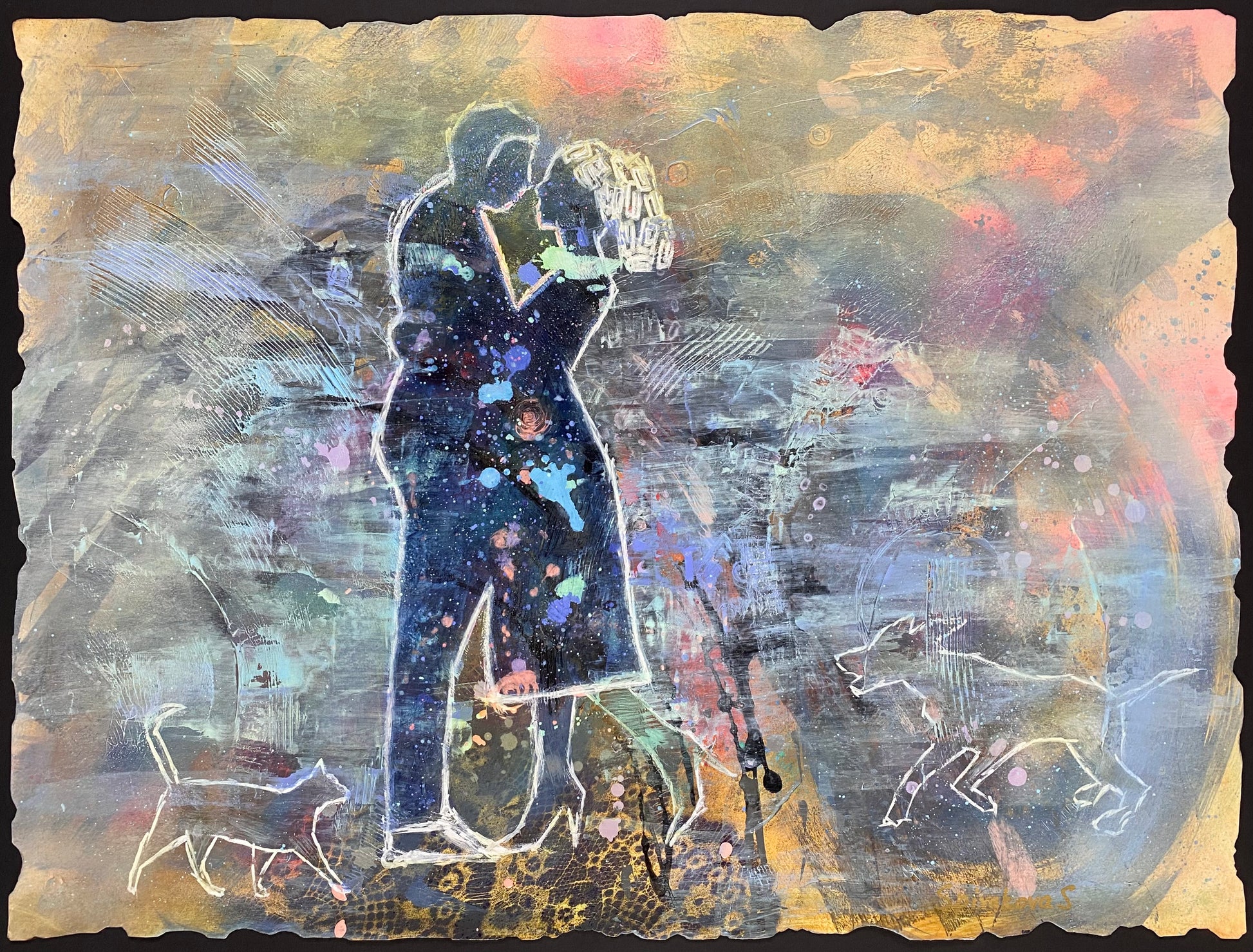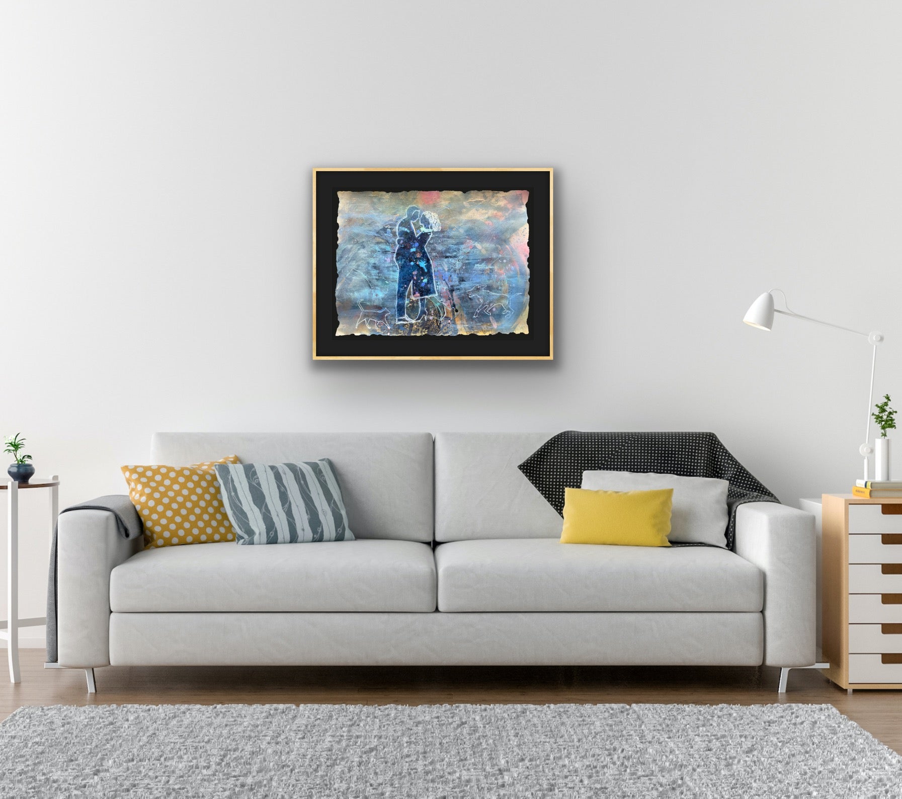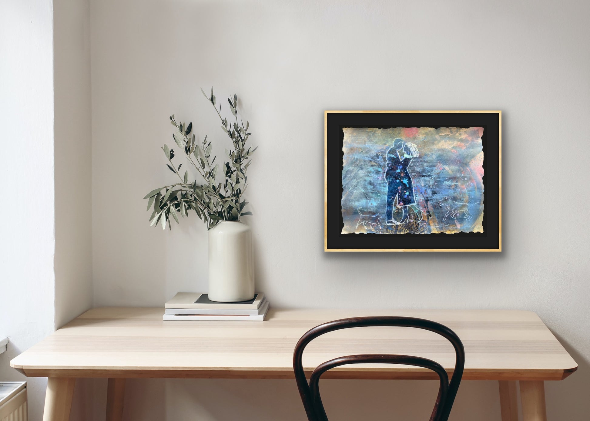 Mixed media: different types of acrylics, modeling paste, and oil paint on paper. The edges of the painting crafted with flames. The painting is glued to ultra-black mounting board and framed in hand painted metal frame.