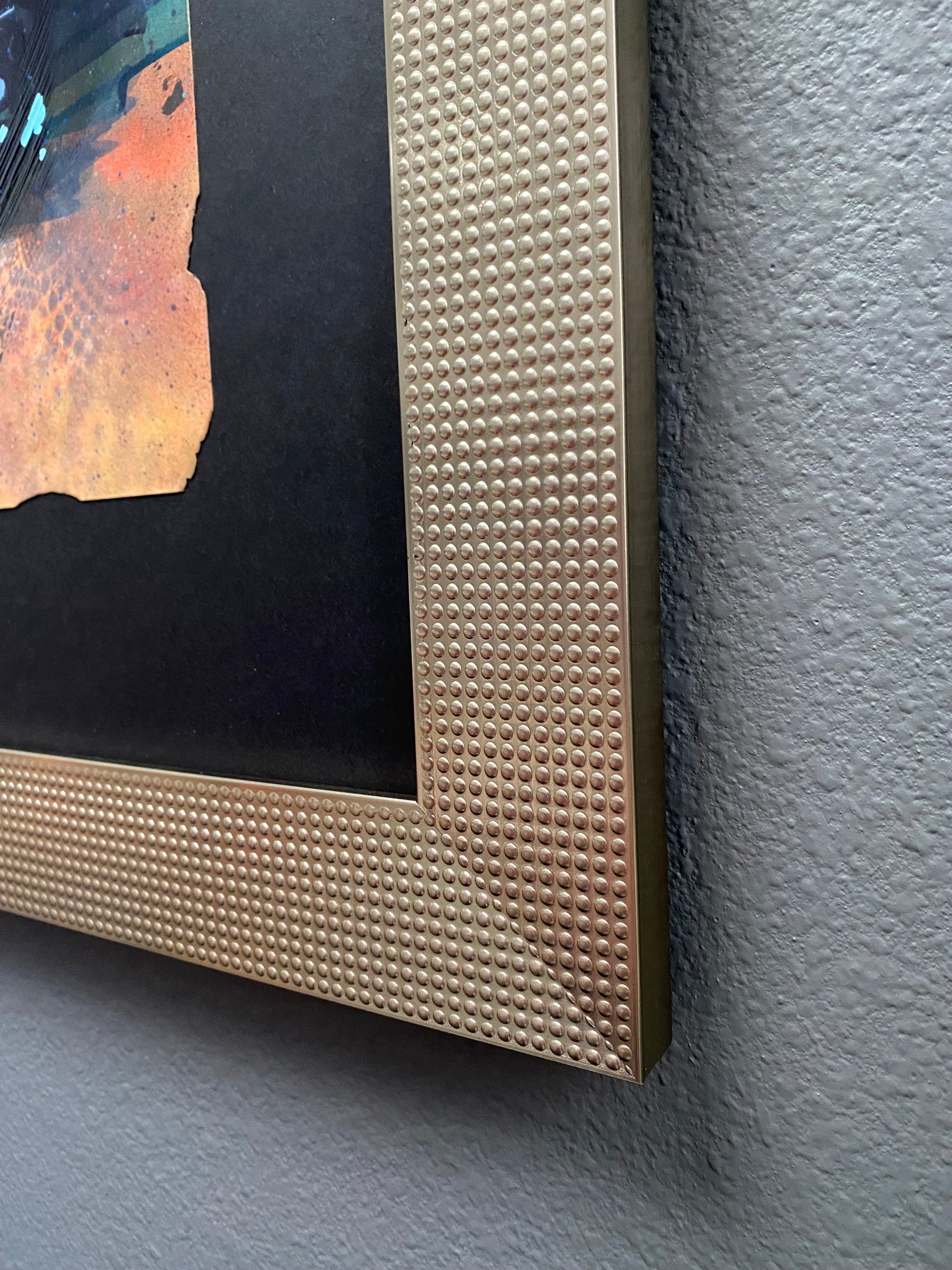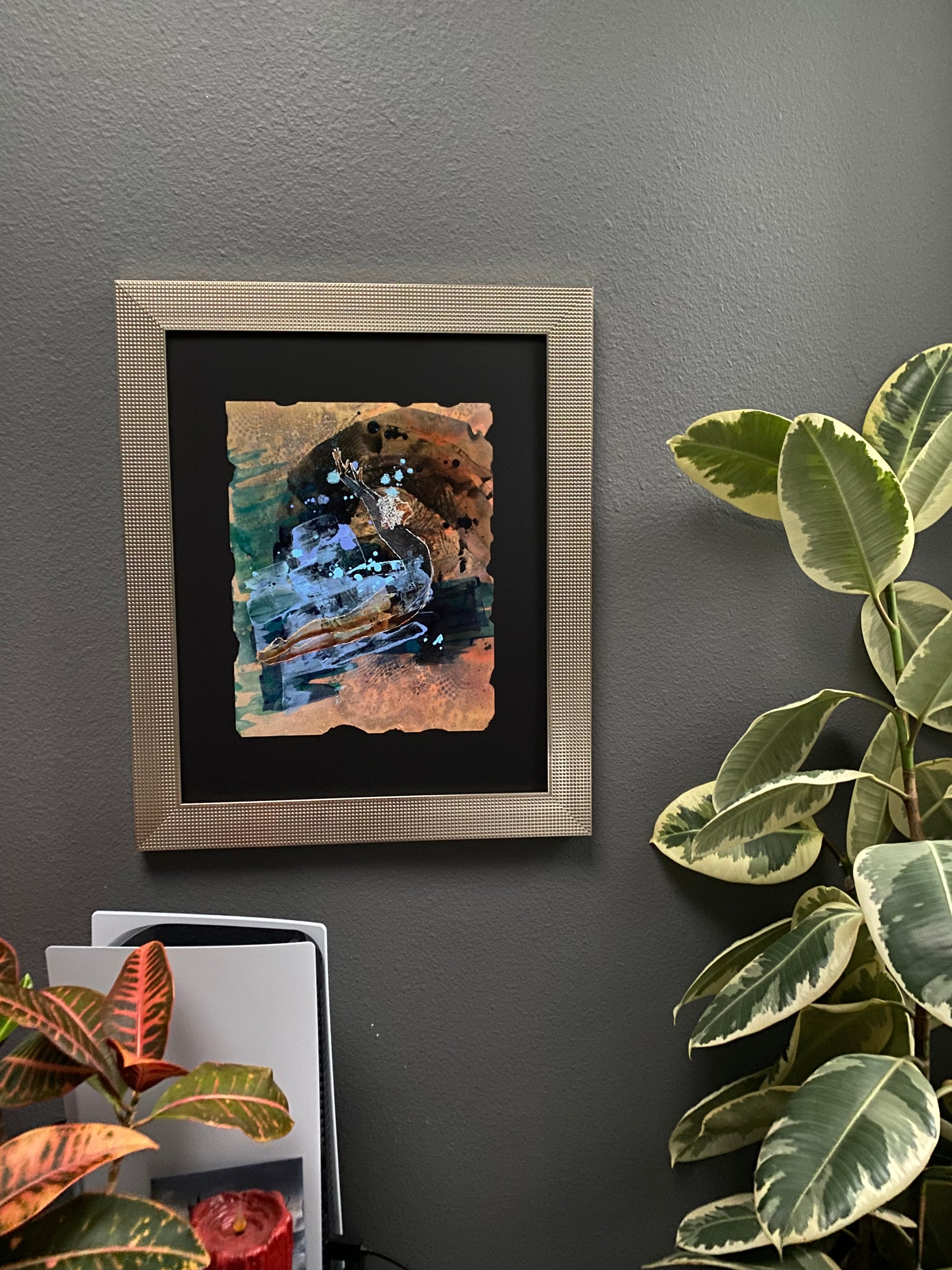 Mixed media: different type of acrylics, spray paint, markers, inks, acrylic medium. The edges of the painting crafted with flame. The painting is mounted to a black mounting board, and framed.